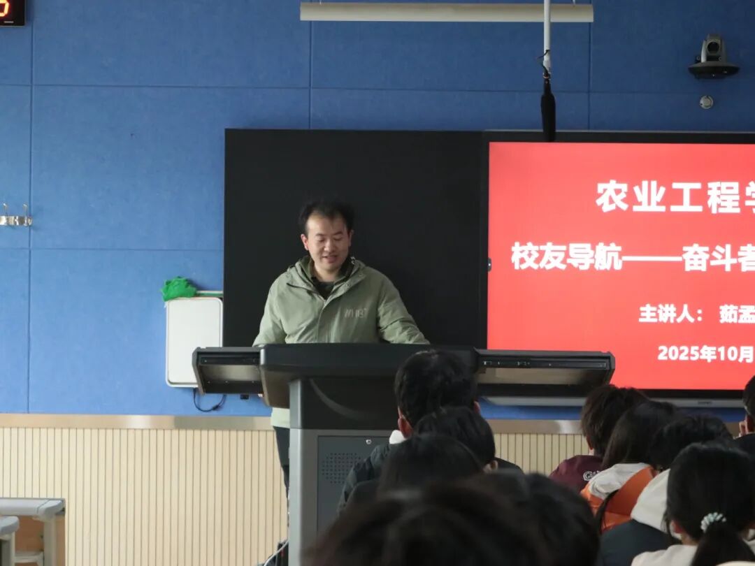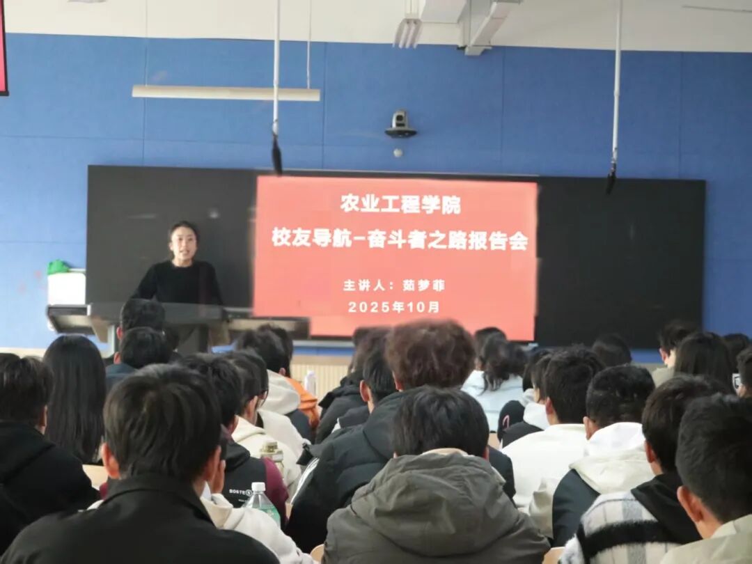 为充分发挥优秀校友的示范引领作用,助力学生明确成长方向、激发奋斗动力,10月23日,农业工程学院在勤学楼7B-609教室举办“校友导航——奋斗者之路”报告会。本次活动由学院分团委书记张蓉瑞主持,特邀优秀校友茹孟菲担任主讲,2025级部分学生积极参与聆听。