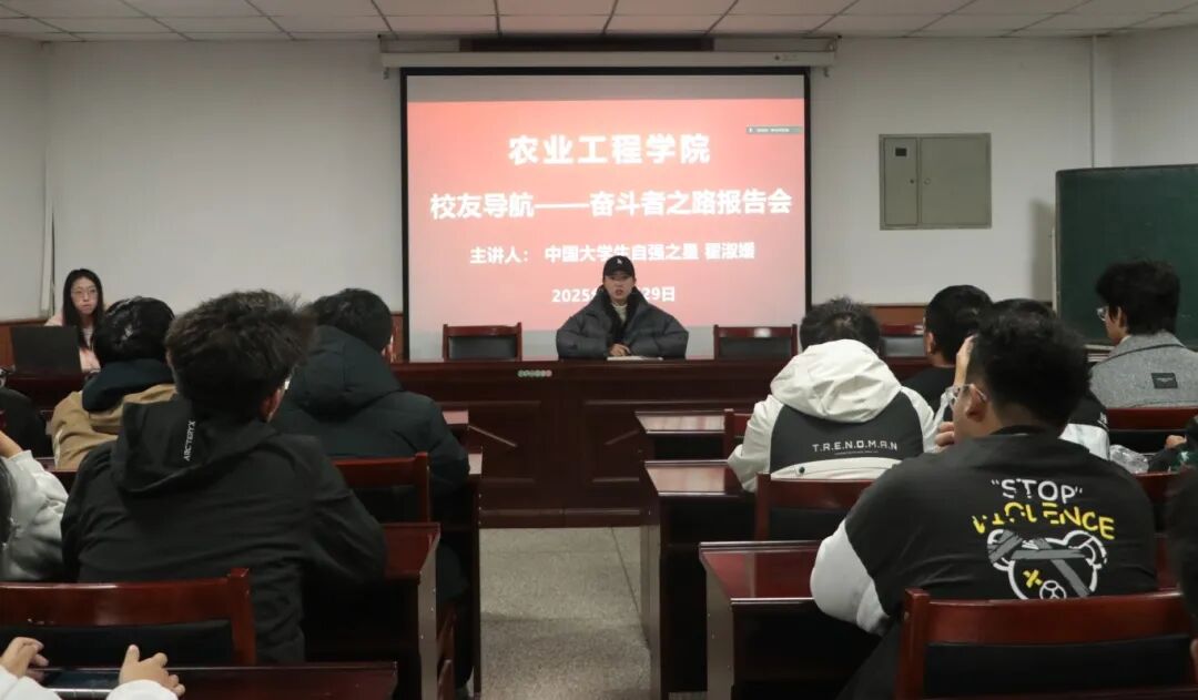 为帮助2025级学子明确学习方向、激发奋进动力,营造优良学风,10月29日,农业工程学院在二楼会议室举办“校友导航——奋斗者之路”报告会。本次活动由辅导员孟一慧主持,特邀“中国大学生自强之星”获得者、优秀校友翟淑媛线上主讲,部分2025级学生现场参与。